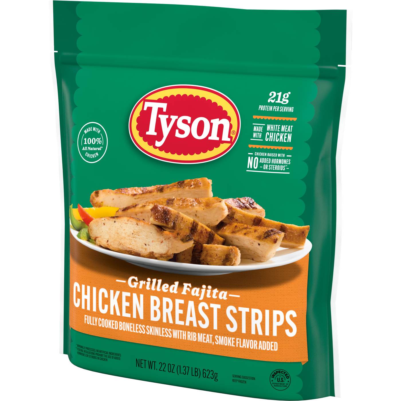 Whether served with guacamole, sour cream or salsa, make the most of your flavor combinations with Tyson Grilled & Ready Fajita Chicken Breast Strips. Our frozen fajita chicken strips are made with 100% all natural white meat chicken with no added hormones or steroids for a simple, real chicken base. Fully cooked and with 21g of protein per serving, our fajita chicken breast strips are perfect for quesadillas and pastas. Keep frozen until ready to prepare, then heat in a skillet, microwave or air fryer according to the instructions on the package for warm chicken breast strips with fajita flair. Minimally processed, no artificial ingredients Federal regulations prohibit the use of added hormones or steroids in chicken.