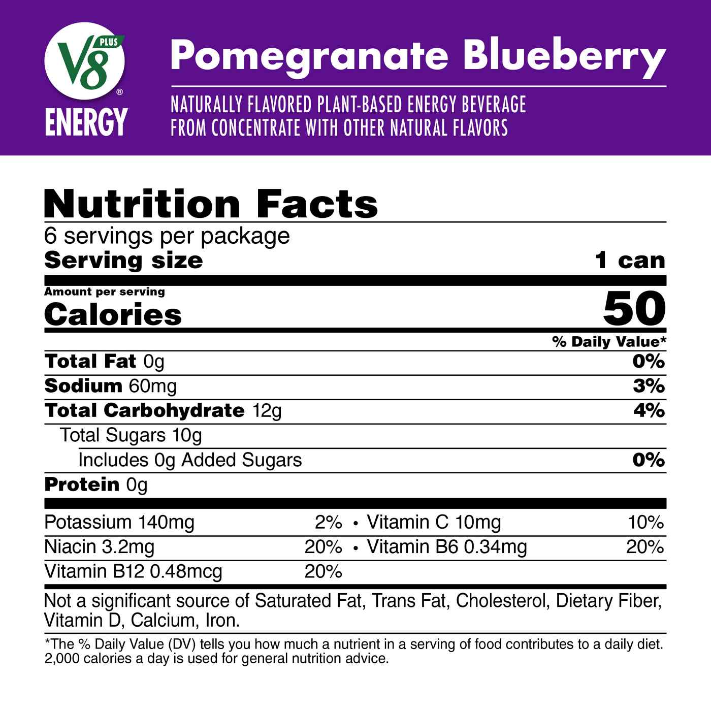 • Six (6) 8 fl oz cans of V8 Energy Pomegranate Blueberry Energy Drink• A pomegranate blueberry flavored energy drink with no added sugar*• Supports focus and Steady Energy; contains 80 milligrams of caffeine – comparable to a cup of coffee• A refreshing beverage with 50 calories and 12 grams of carbs per can; an excellent source of B Vitamins• Contains 1 combined serving of veggies and fruits. Non-GMO, and gluten free.
