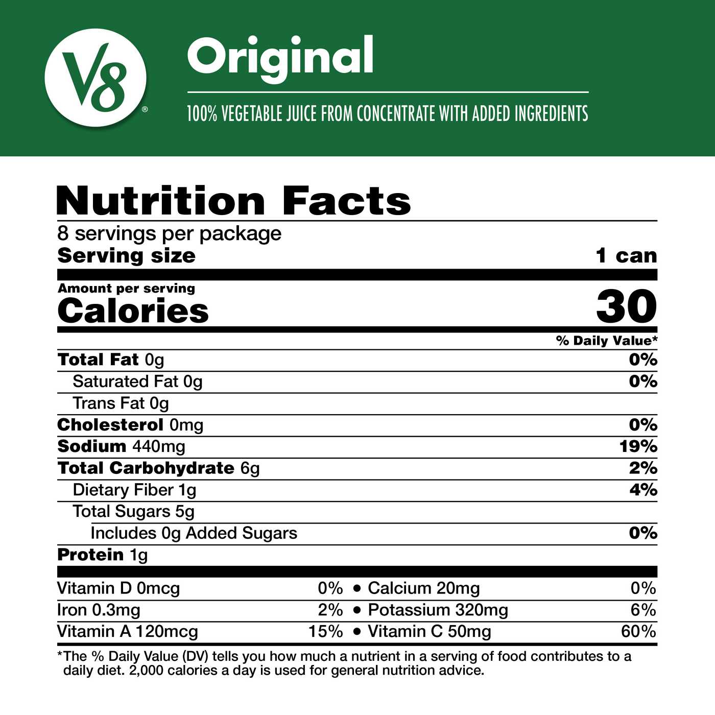Savor the plant-based goodness of V8 Original 100% Vegetable Juice. A satisfying alternative to other juices, it's made with concentrated tomato juice along with the juices of seven other vegetables. The result is a 100% juice with a distinctly rich, savory flavor. Each 5.5 fl oz can contains 1 serving of vegetables and is an excellent source of vitamin C. Also gluten free and non-GMO with no artificial colors.
