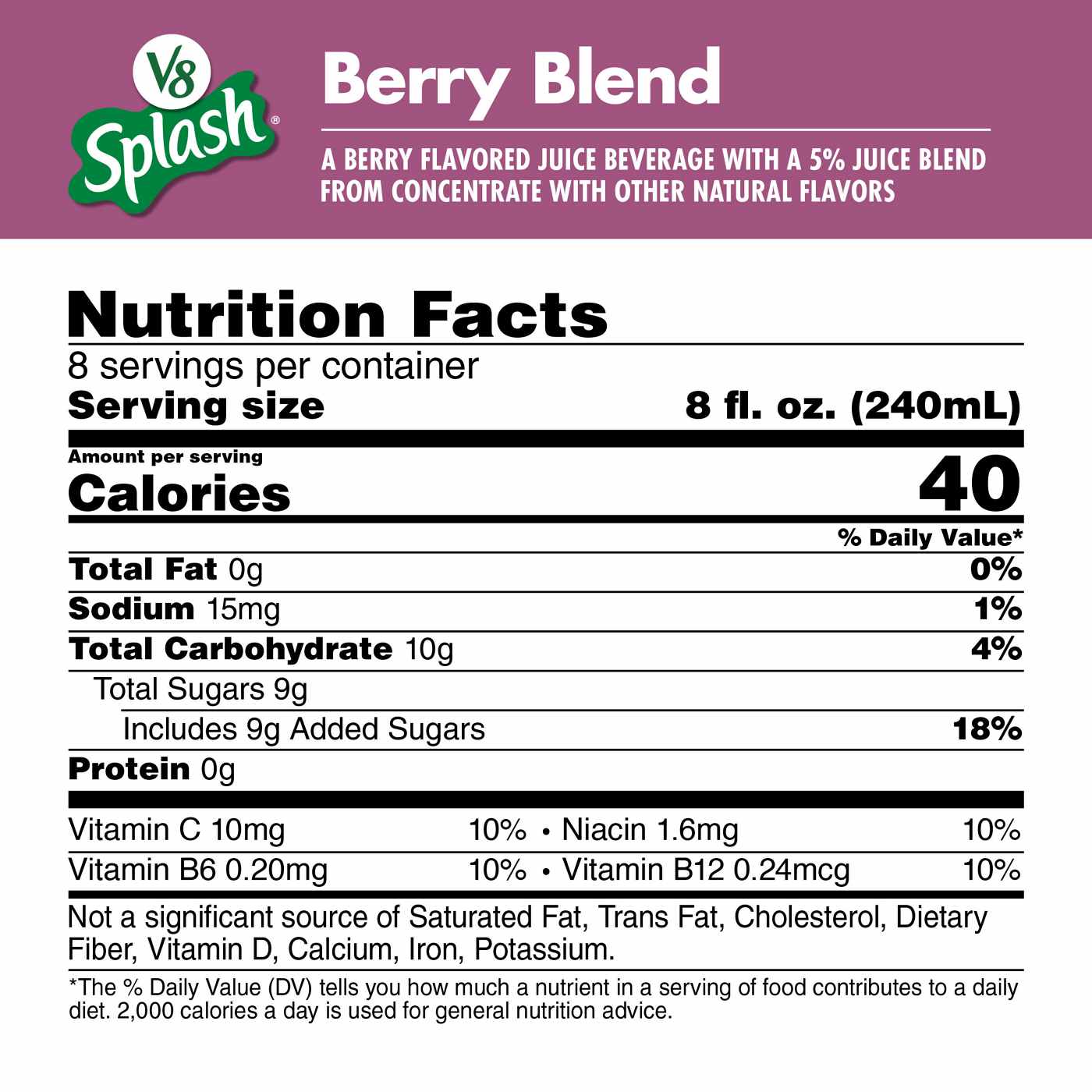 V8 Splash Berry Blend Flavored Beverage is a fruity burst of refreshment that the whole family can enjoy. It features berry flavors. It's vegetarian-friendly and contains antioxidant Vitamin C and B vitamins. It's perfect for any occasion—breakfast, lunchboxes, mocktails, or smoothies. Packed with flavor and versatility, it brightens family time.V8 Splash Berry Blend flavored beverage is made with flavors like berryContains antioxidant vitamin C and B vitaminsMade with 5% juice and is gluten freeV8 Splash is a lower calorie alternative to orange juice and apple juiceFlavorful refreshment for the whole family