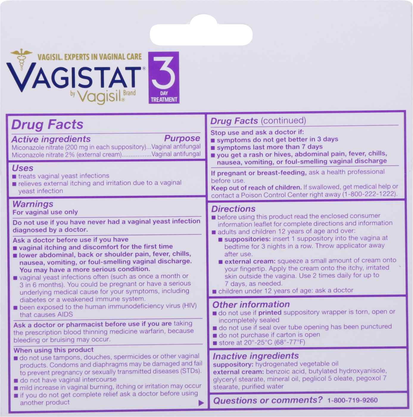 Active Ingredients: Miconazole Nitrate (200 mg in Each Suppository), Miconazole Nitrate (2%) (External Cream). Inactive Ingredients: Suppository: Hydrogenated Vegetable Oil. External Cream: Benzoic Acid, Butylated Hydroxyanisole, Glyceryl Stearate, Mineral Oil, Peglicol 5 Oleate, Pegoxol 7 Stearate, Purified Water.Allergens and safety warnings