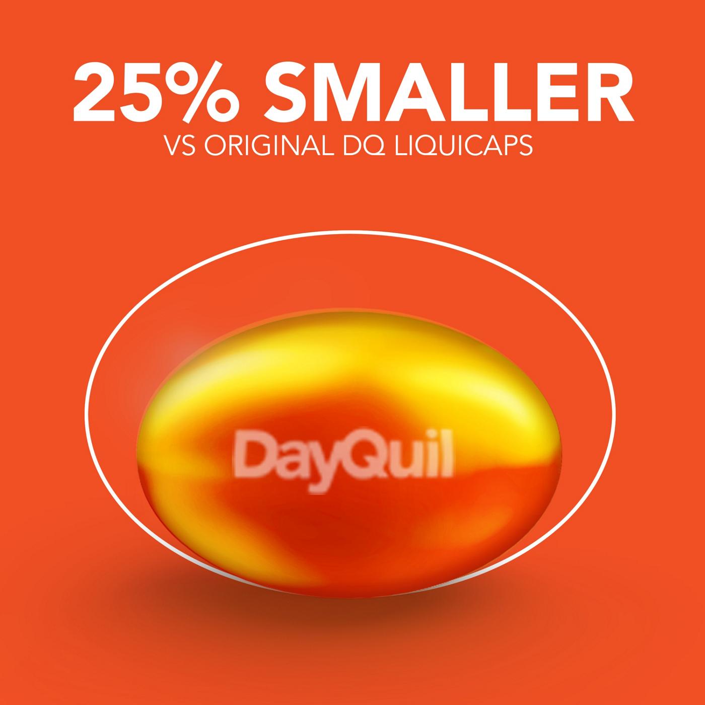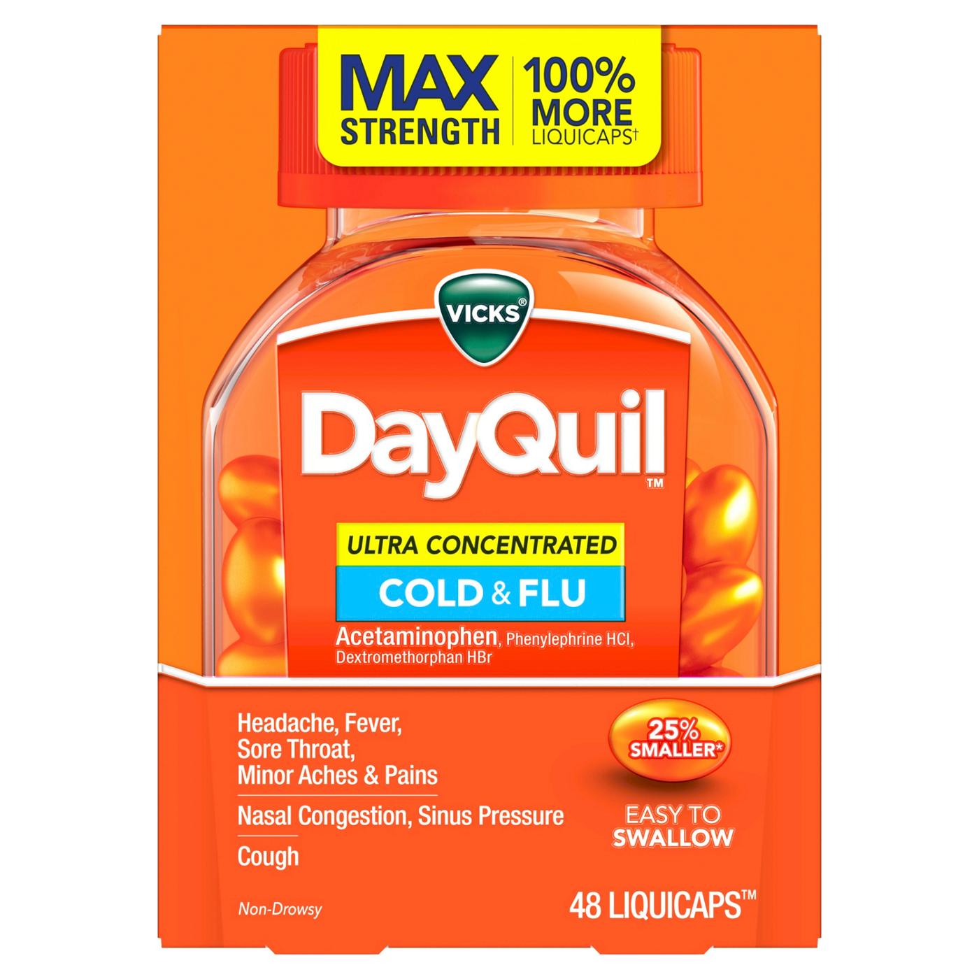 Vicks DayQuil Ultra Concentrated Cold & Flu provides powerful, non-drowsy, daytime relief for your worst cold and flu symptoms. DayQuil relieves headache, fever, sore throat, minor aches & pains, nasal congestion, and cough. Contains acetaminophen. Now available in 25% smaller liquicaps compared to original DayQuil LIquicaps. Now available in an easy to open bottle.