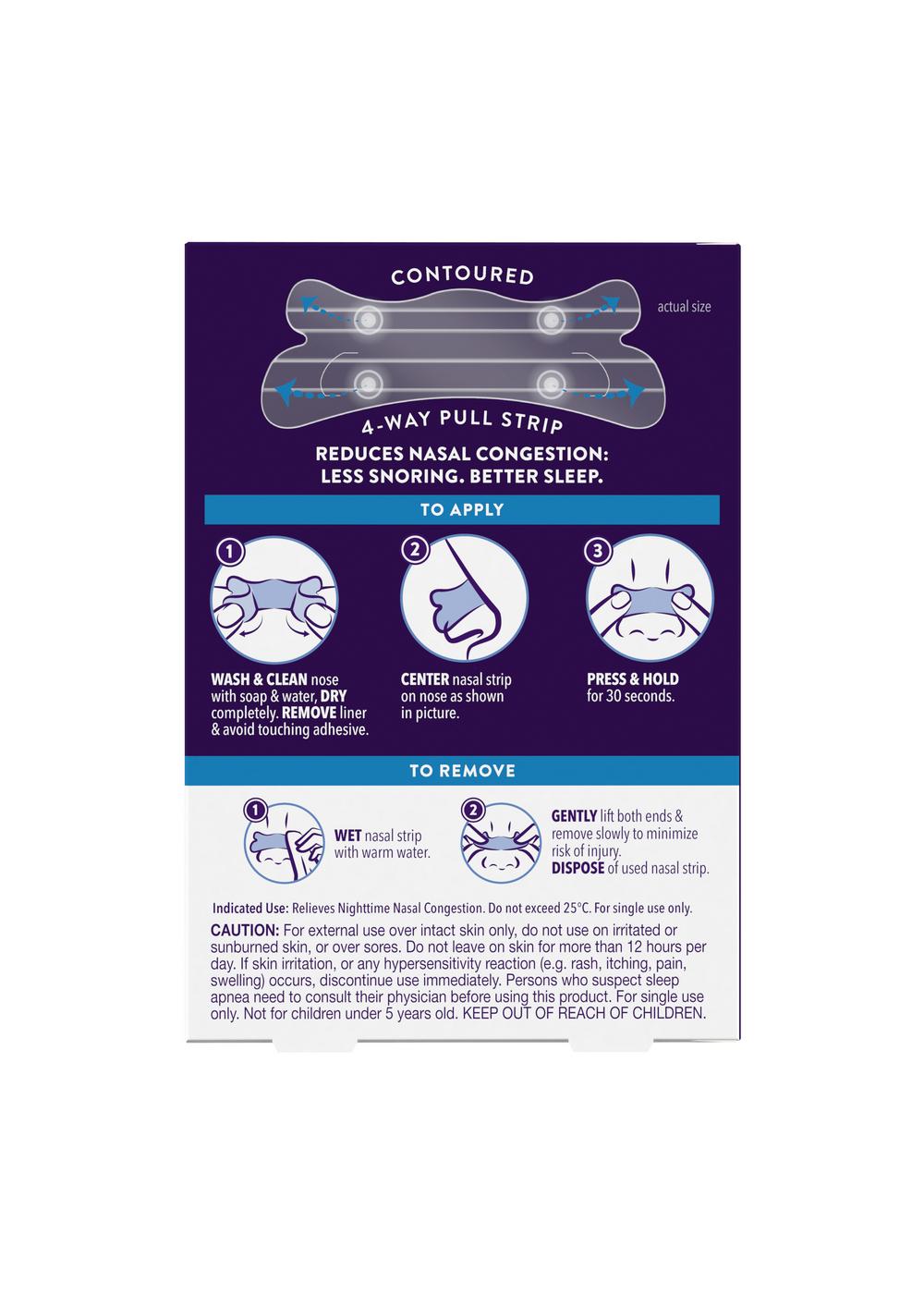ZzzQuil Sleep Nasal Strips instantly open your nose for all-night easier breathing! These clear nasal strips feature 4-point pull design which opens your nose, so you can breathe and sleep better.^ They can also reduce snoring by improving breathing. These ZzzQuil Sleep Nasal Strips have gentle adhesion with maximum staying power, so they can stay on through the night. These nighttime nasal strips also have a comfortable fit that stays on all night. They are drug-free, unscented, and non-habit forming for nightly use. They are easy to apply and have easy, irritation-free removal as well. ZzzQuil brings you Sleep Nasal Strips, so you can breathe better, sleep better, and wake up refreshed. ^Instantly relieves nasal congestion to improve breathing, snoring, and sleep. in a blinded sequential monadic home usage test (n=185). statistically significant at 95% confidence compared to leading nasal strip brand Breathe Right and Private Label in a blinded sequential monadic home usage text (n=185).