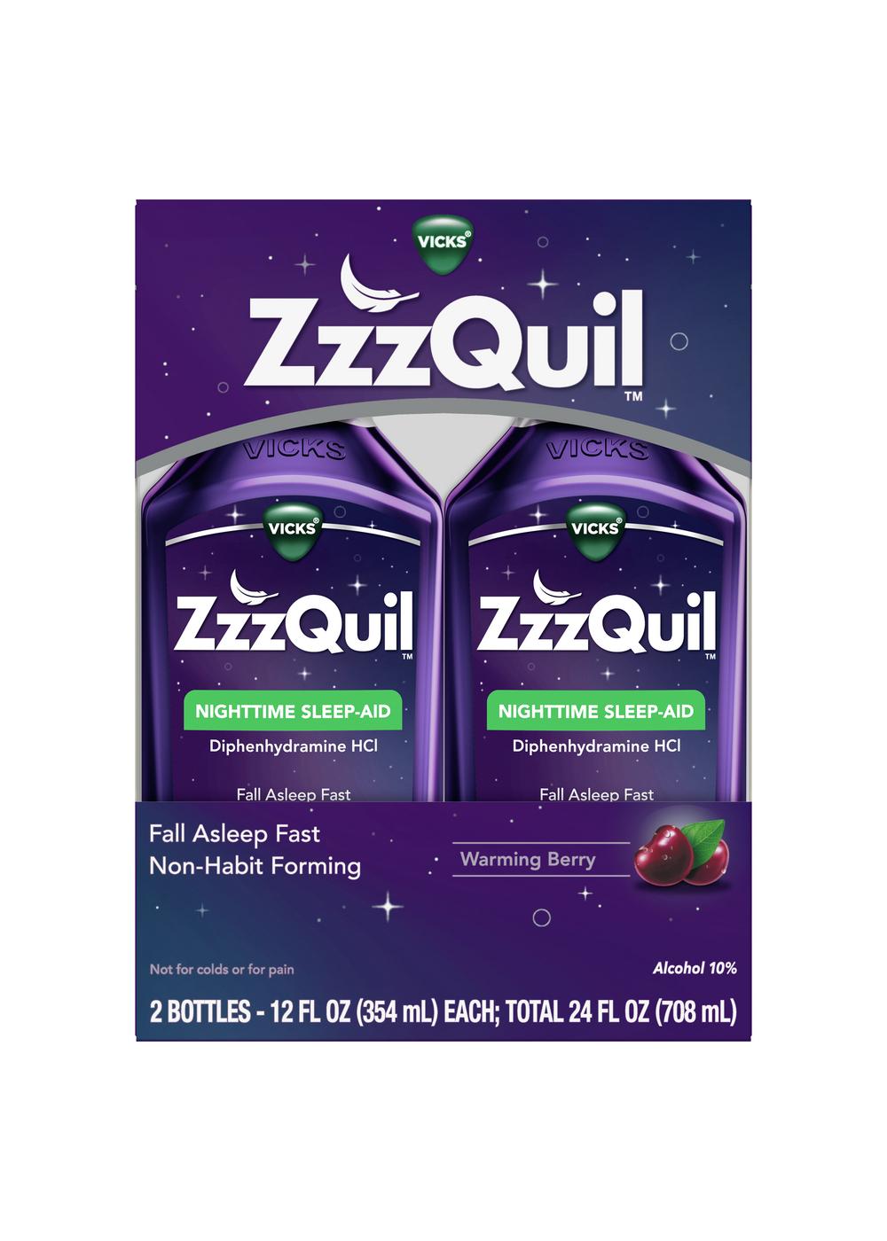 When you're having trouble getting that sound sleep your body craves, add some Zzzs to your night with ZzzQuil. This ZzzQuil sleep aid works to help you fall asleep fast - in as little as 20 minutes - so you can get sleep when you need it and wake refreshed. All ZzzQuil sleep aid products are non-habit forming and specifically formulated with clinically proven ingredients by our team of dedicated scientists. This ZzzQuil sleep aid contains a non-habit-forming ingredient, Diphenhydramine HCI, which causes drowsiness by blocking the action of histamine, a chemical that sends waking signals to the brain. For this sleep aid, each dose (one 30 mL dose cup) contains 50 mg. ZzzQuil Warming Berry Liquid Sleep Aid tastes great - you'll look forward to falling asleep whether you are at home or traveling through multiple time-zones. ZzzQuil over-the-counter medicine sleep aids for adults can be used to treat occasional sleeplessness when you need a little extra help getting to sleep. ZzzQuil is the World's #1 Sleep Aid Brand! Explore ZzzQuil's range of products to help you fall asleep, including our line of ZzzQuil PURE Zzzs Melatonin products.Source Euromonitor International Limited; Consumer Health 2024 Edition; Sleep Aids, all channels, retail selling price, Global Brand Name ZzzQuil 2023 data^vs. placebo