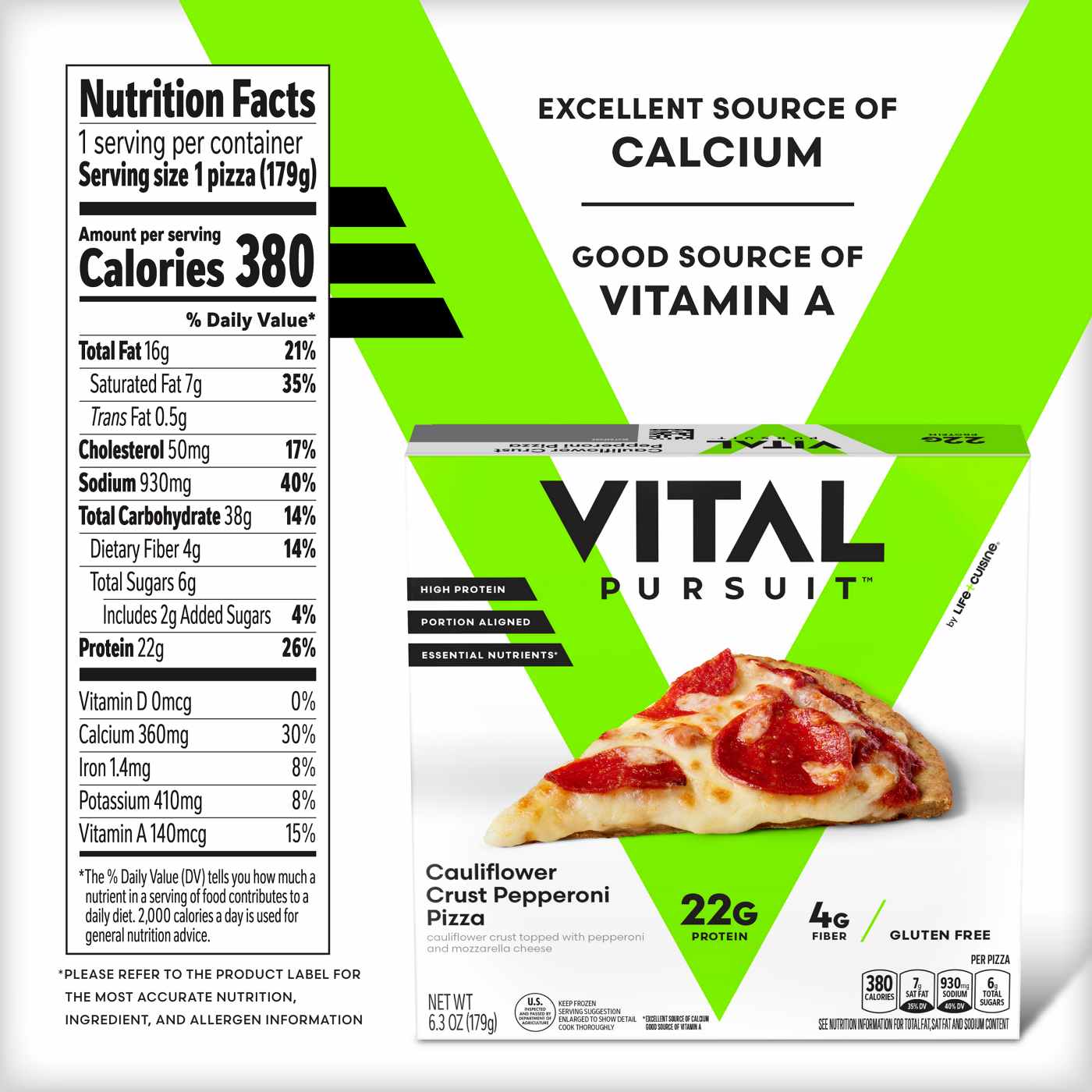 • GLP-1 FRIENDLY: Indulge in Vital Pursuit Cauliflower Crust Pepperoni Pizza. This gluten free pizza is GLP-1 friendly and a perfect portion-aligned option for those seeking a high protein meal• HIGH PROTEIN AND ESSENTIAL NUTRIENTS: Vital Pursuit meals are designed for GLP-1 users with fiber and high protein. This gluten free frozen pizza is packed with twenty-two grams of protein and four grams of fiber• DELICIOUS, CONVENIENT MEAL: Experience the ease of frozen lunch or dinner with our individual pizza. This cauliflower crust pizza is topped with pepperoni and mozzarella cheese• SOURCE OF VITAMINS: Savor the rich taste of our frozen pepperoni pizza. This high protein pizza is a good source of vitamin A and an excellent source of calcium, and is made with a preservative free cauliflower crust and real cheese• EASY PREP ANYTIME: Keep this portion-aligned protein pizza handy for a quick, nutritious lunch or dinner. To prepare, cook it in your air fryer at three-hundred degrees Fahrenheit for twelve minutes. Or quickly cook it in the microwave for three minutes and ten seconds on high• A THRIVING LIFE: We believe what you eat is vital to get you where you're going. That's why our individual pizzas are designed with high protein and essential nutrients you need, like vitamin A and calcium, to help you get there. Who knew progress could taste this good?