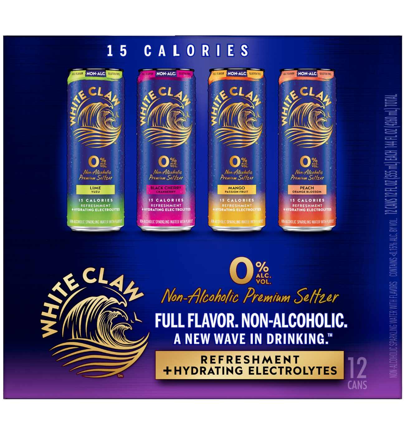 "White Claw Zero Proof. Sophisticated adult refreshment that tastes as good as it is good for you, both physically and mentally. Active hydration in the moment, and replenishment for the day after. Intriguing White Claw flavors now alcohol free. A new wave in drinking. White Claw Non Alcoholic Premium Seltzer, 12 pack, 12 fl oz Cans, 0.0% ABV