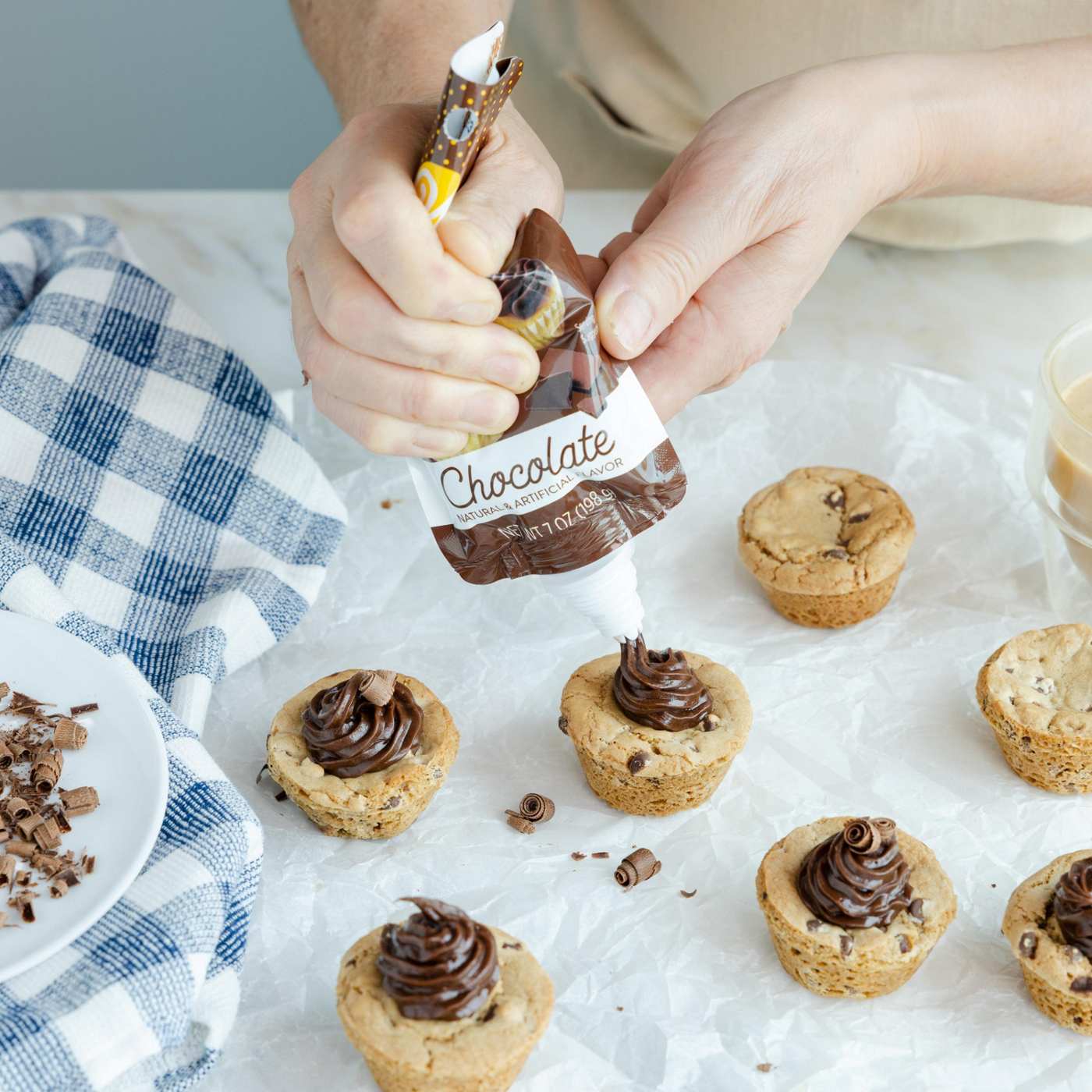 Give a flavorful, decorative flair to your favorite treats with this ready-to-use chocolate flavored icing. Great for use on sugar cookies, cupcakes, cakes and more, this chocolate flavored buttercream looks and tastes delicious on any dessert! This chocolate flavored ready-to-use icing pouch includes two piping tips, one star and one round, for easy and convenient decorating. Best of all, no need for piping bags! You can use this icing pouch with most standard Wilton tips and couplers. Simply attach any standard piping tip to the bag using a standard coupler, then pipe your design! With a rich chocolate flavor, this icing is a delicious way to decorate all your favorite treats!