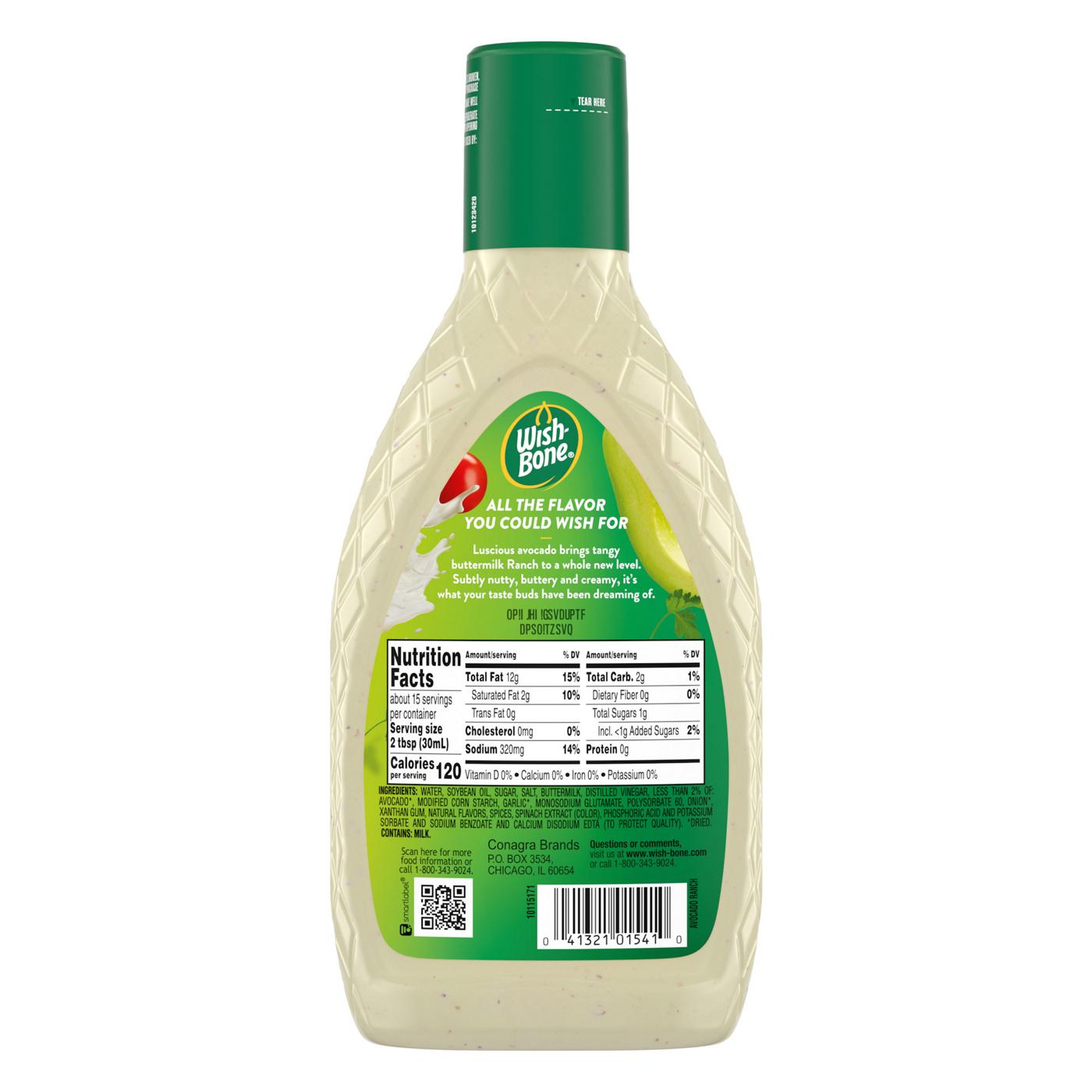 How do you make ranch dressing even more delicious? Add avocado. Wish-Bone Avocado Ranch Salad Dressing combines classic ranch with a twist of avocado for a subtly nutty, buttery and creamy taste that is sure to be a hit. From romaine and iceberg lettuce to organic greens and beyond, your lunch salad will reach new flavor heights with this creamy avocado ranch dressing. Perfect on salads, for dipping wings, veggies and appetizers, or in your favorite recipes. Wish-Bone: All the Flavor You Could Wish For.