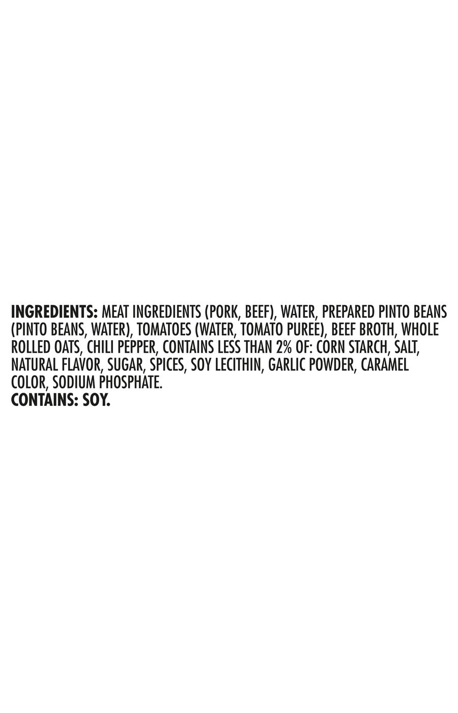 Meat Ingredients (Pork, Beef), Water, Prepared Pinto Beans (Pinto Beans, Water), Tomatoes (Water, Tomato Puree), Beef Broth, Whole Rolled Oats, Chili Pepper, Contains Less than 2% of: Corn Starch, Salt, Natural Flavor, Sugar, Spices, Soy Lecithin, Garlic Powder, Caramel Color, Sodium Phosphate.Allergens and safety warnings