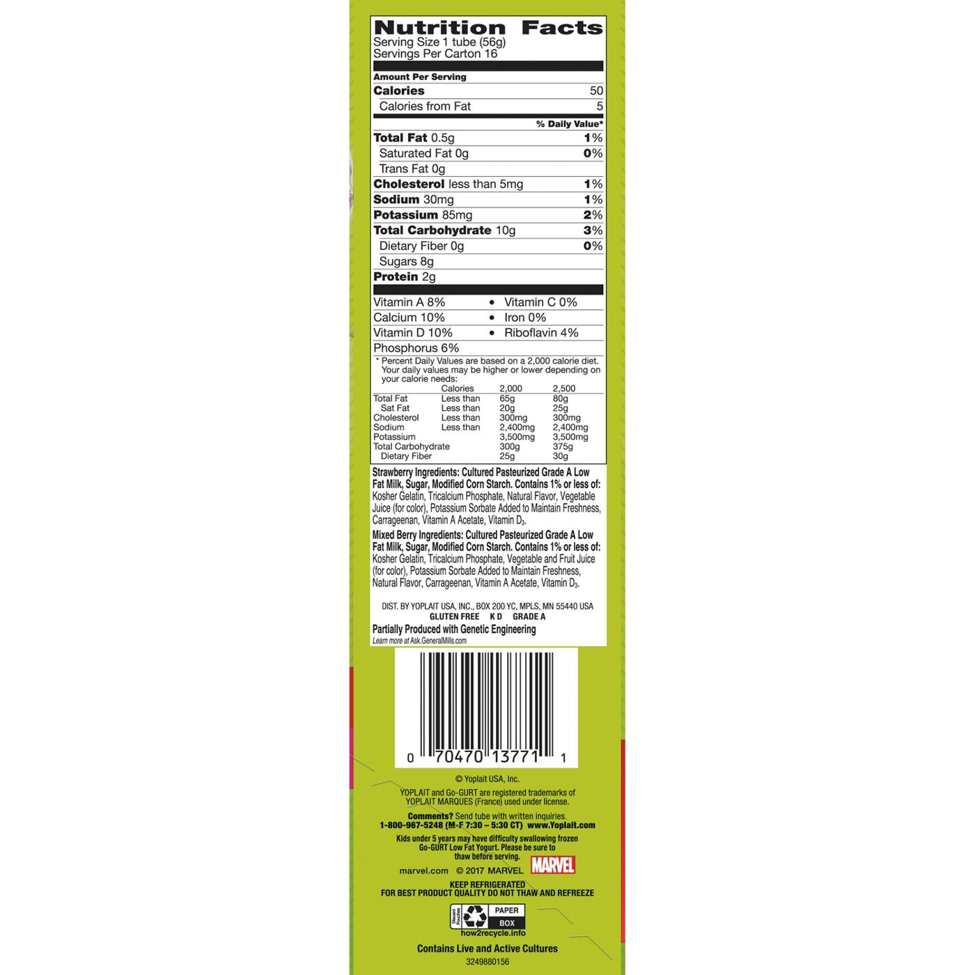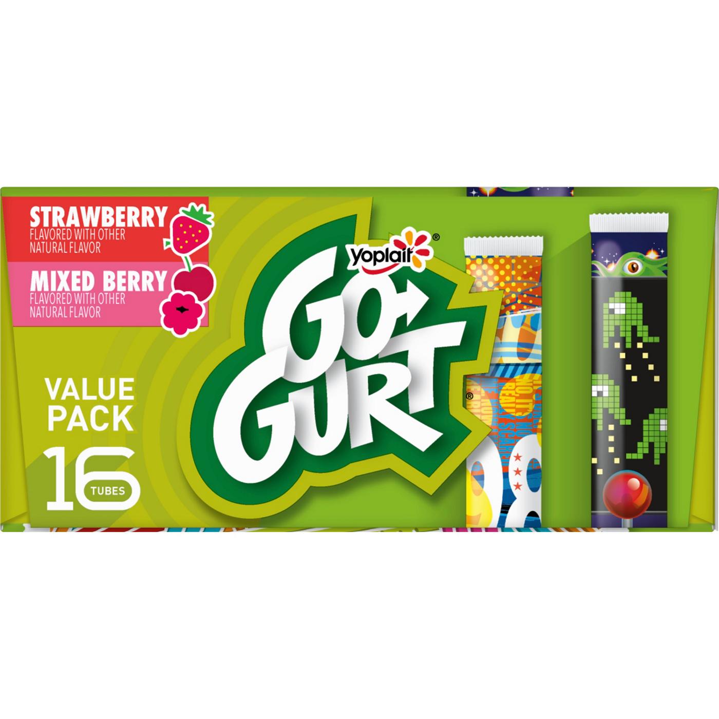 CONTAINS: One 2 lb Value Pack of Yoplait Go-GURT Bluey Strawberry Flavored and Mixed Berry Flavored Fat Free Yogurt; Sixteen 2 oz yogurt tubes total