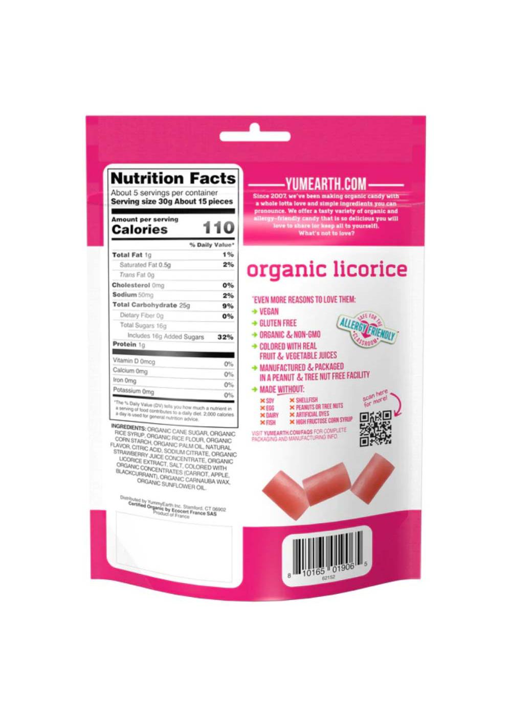 Organic Cane Sugar, Organic Brown Rice Syrup, Organic Rice Flour, Water, Organic Corn Starch, Organic Palm Fruit Oil, Natural Flavor, Citric Acid, Sodium Citrate, Organic Pomegranate Juice Concentrate, Organic Strawberry Juice Concentrate, Organic Licorice Extract, Salt, Colored with Organic Concentrate (Carrot, Apple, Blackcurrant), Organic Carnauba Wax, Organic Sunflower Oil.