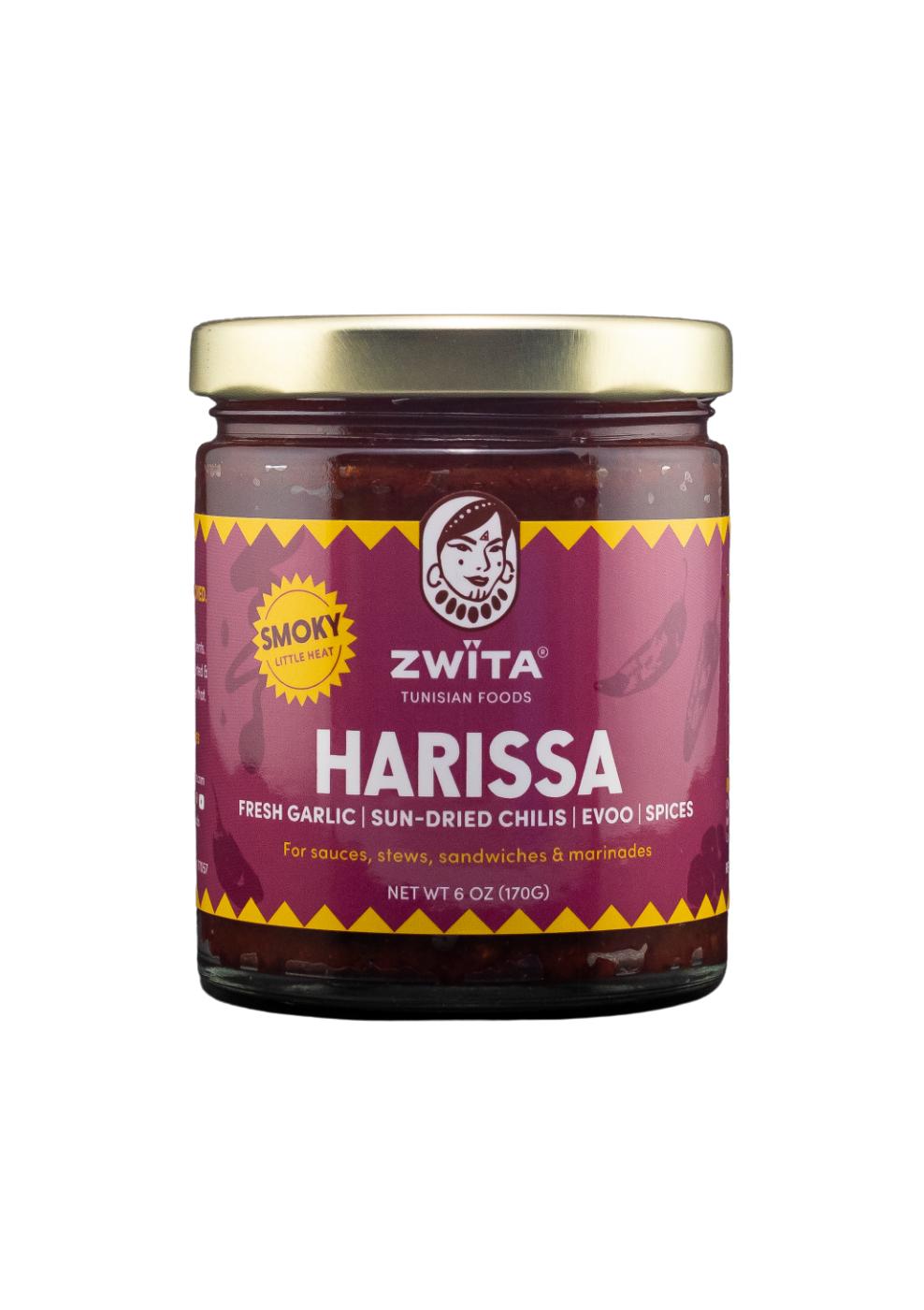 The smoky harissa’s base contains a special blend of sun-dried and smoked chilis, creating a harmonious marriage of smoke and heat. If you appreciate smokiness and can handle a little heat, this one’s for you!Traditional harissa is a staple found on the table and in everyday Tunisian cooking. This traditional harissa paste is made by grinding rehydrated whole sun-dried chilis and smoked chilis with fresh garlic and salt into a paste that is thereby mixed with a family blend of coriander, caraway, and extra virgin olive oil. The sun-drying and smoking processes concentrate the juicy flavors of the chilis giving Zwïta's traditional harissa a deep flavor and full-bodied texture that is incomparable to lower quality, industrial versions that use tomato products, fresh peppers, or re-hydrated chili powder as their base.• Zwïta won 2nd place at H-E-B’s Quest for Texas Best competition in 2022.• Traditional, thick, garlicky sun-dried chili paste.• Ancestral recipe.• Deep level of smokiness complemented by a little heat.• Plant based.• Free of all major allergens.• All natural ingredients, no additives.