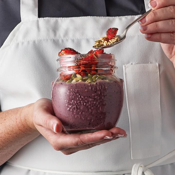- Pour puree into a large bowl and top with granola, pepitas, chia seeds, goji berries and strawberries.