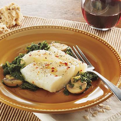 - When fish is baked, place on a platter and top each fillet with the mushroom and spinach mixture. Serve hot.