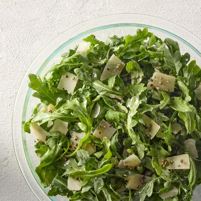 - In a large bowl combine arugula and Parmesan, tossing well to evenly distribute cheese.
