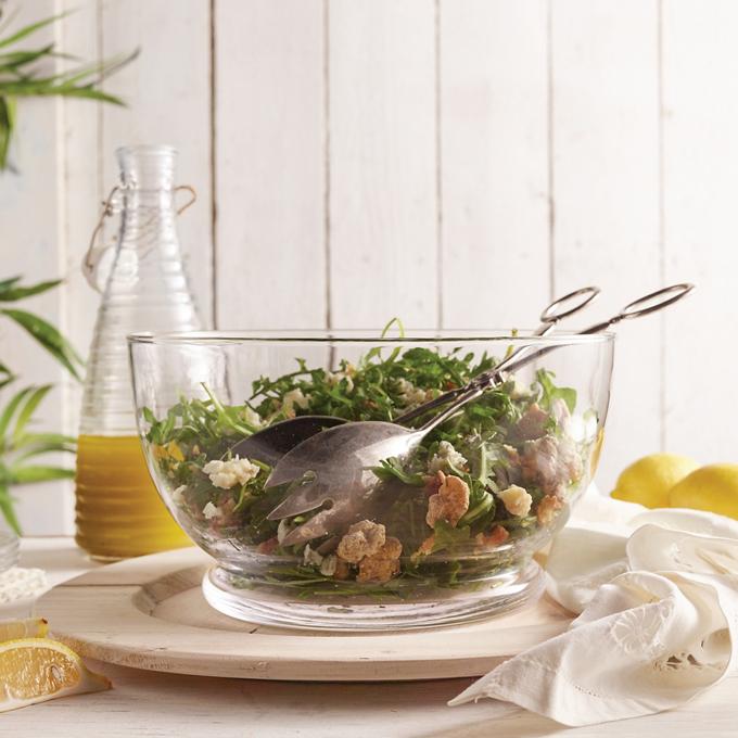 - Arrange arugula greens, pancetta, blue cheese and walnuts in a bowl then drizzle dressing on top.
