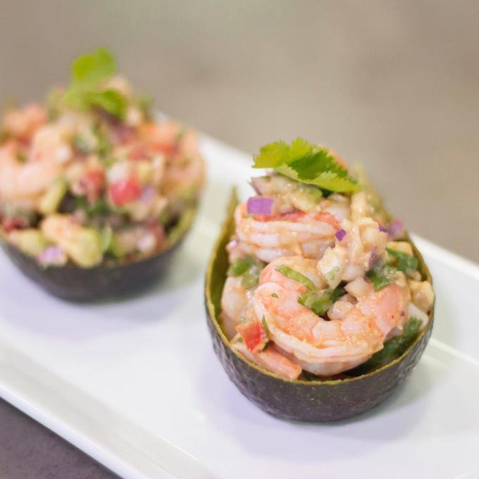 - Fill each ½ avocado skin with shrimp cocktail mixture. Serve chilled or fresh at room temperature.