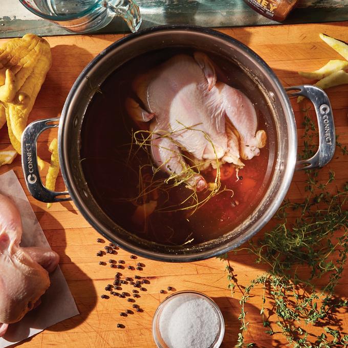 - Chef's Note: For best results, brine poultry completely submerged for at least 8 hours. For pork, submerge for 6 to 8 hours.