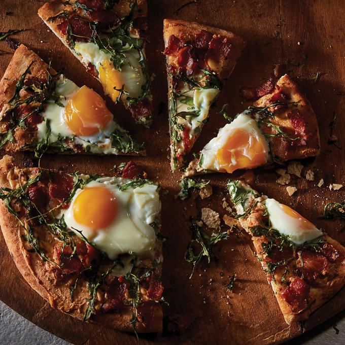 - Place crust on a baking sheet. Spread an even layer of carbonara sauce over pizza crust then top with cooked bacon and arugula. Carefully crack eggs onto pizza (be careful not to break the yolks).