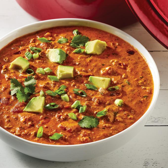 - Stir in chili mix, sour cream and easy melt cheese. Lower heat to medium and add cilantro. Stir and cook until cheese fully melts and soup is heated through.