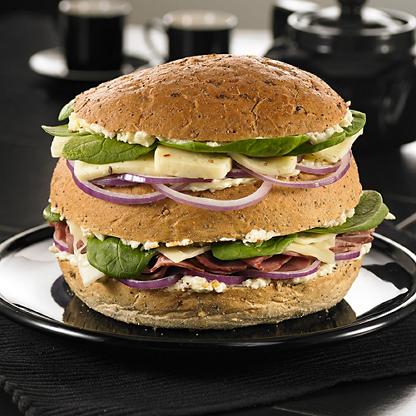 - On bottom slice of bread, layer with onion slices, Swiss cheese, pastrami, 1 1/2 cups spinach, center slice bread, remaining onions, Havarti cheese and remaining spinach.