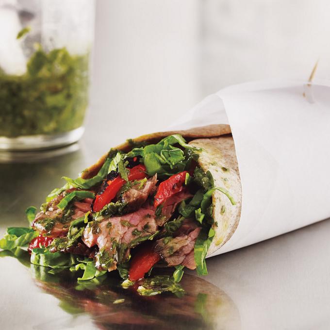 - Spread each tortilla with chimichurri sauce. Top with spinach, roasted peppers and sliced beef.