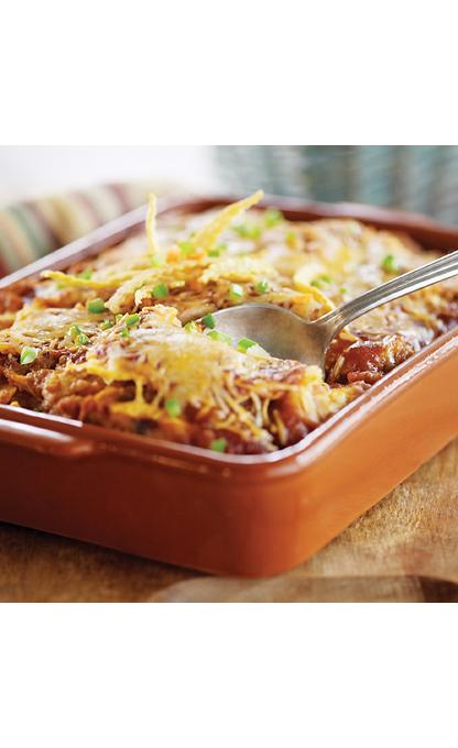 - Repeat layers, finishing with remaining tortillas. Top tortillas with any remaining enchilada sauce and 1/2 cup cheese.