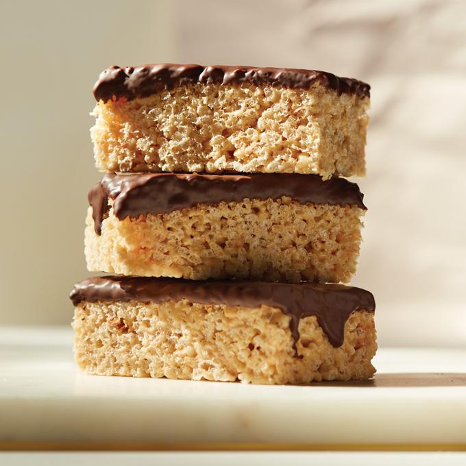 - Meanwhile, microwave candy coating according to package directions. Cut treats into desired shapes and dip each in chocolate coating. Chill again briefly to harden before serving.