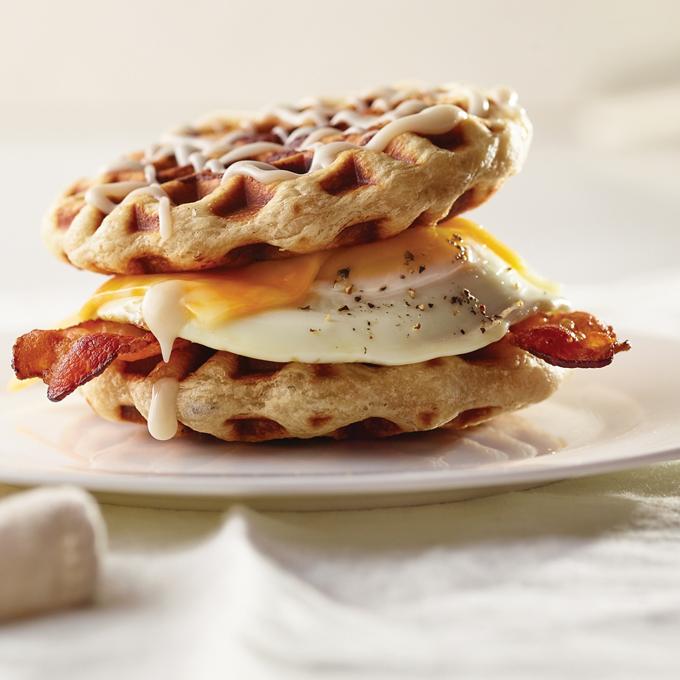 - To assemble, place a hot cinnamon roll on plate, add 2 bacon strips, a sunny side up egg, and cheese. Top with another pressed cinnamon roll.