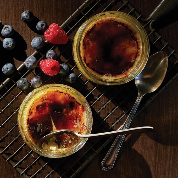 - To serve, add 1 tablespoon of sugar to top of each custard and turn to evenly distribute sugar. Carefully torch tops moving clockwise to evenly melt sugar.