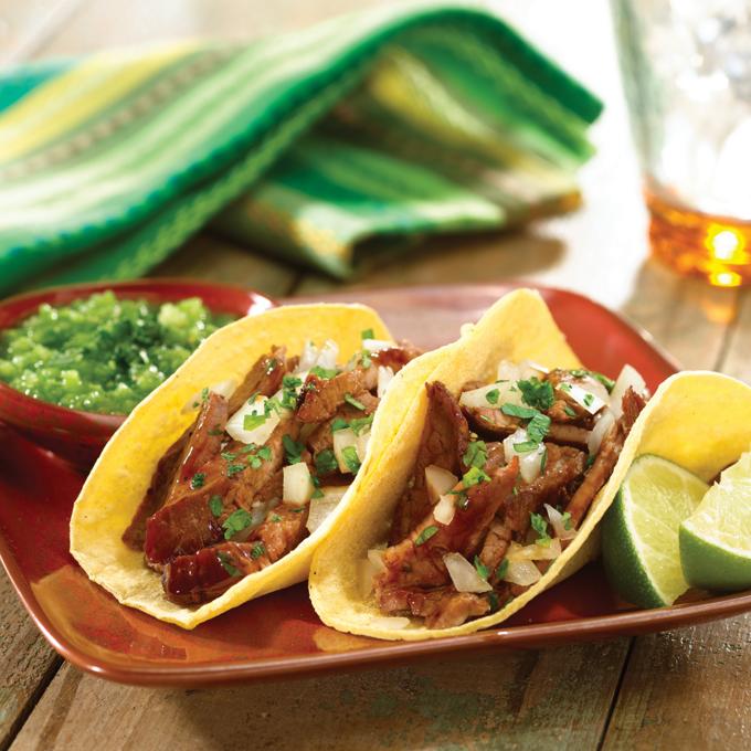- Slice steak and serve in tortillas with chopped onion, cilantro and lime wedges.
