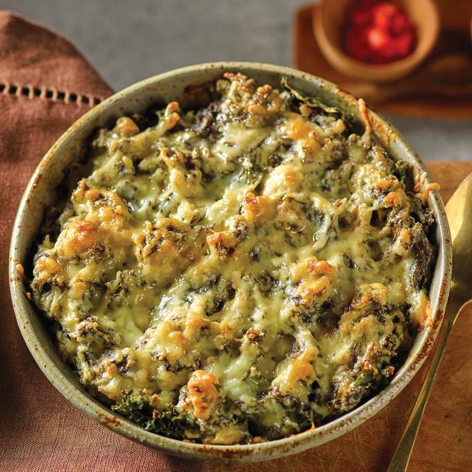 - Remove heavy cream mixture from heat, as well as chopped kale. Combine cream with kale, stir to combine, then transfer to a greased baking dish.
