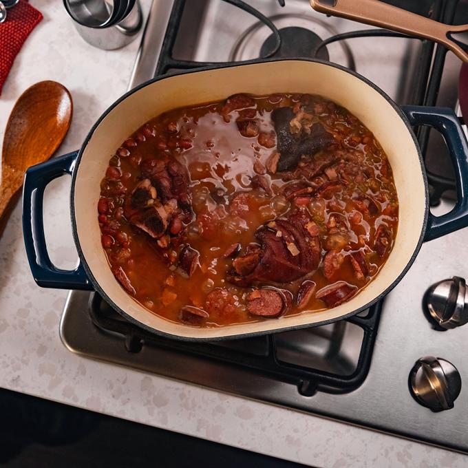 - Stir in Cajun seasoning, salt and pepper, and bring to a boil. Reduce heat to low, cover, and simmer about 1.5 to 2 hours, stirring occasionally, until beans are tender and liquid has thickened to your liking. (If using whole smoked meat pieces, remove after an hour, pull meat from bones, and return meat to the pot.)