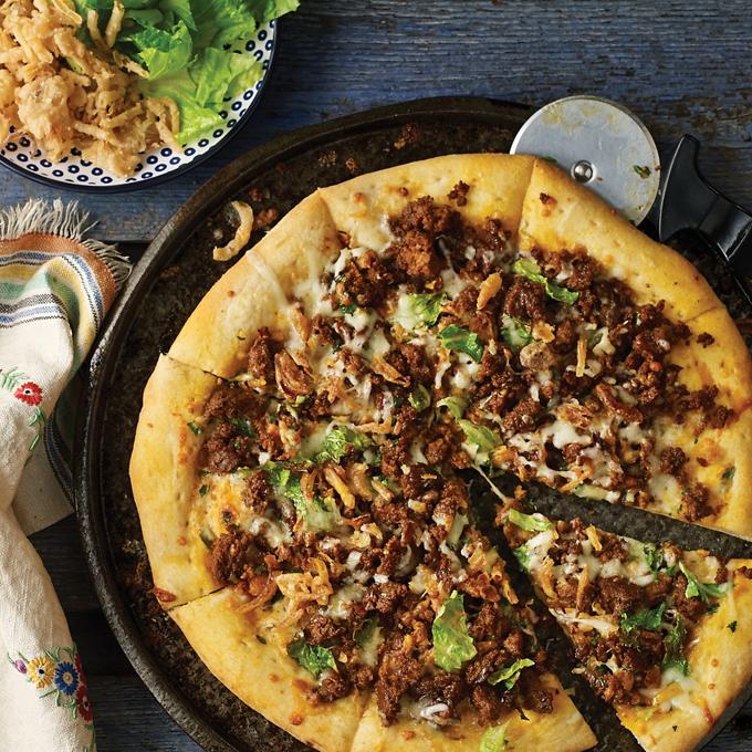 - Brush reserved fat on pizza crust and spread all remaining ingredients evenly over pizza.