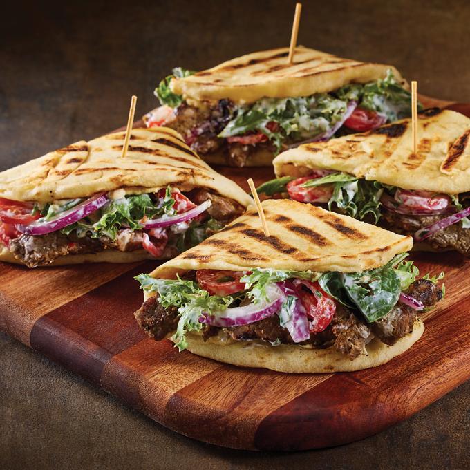 - To build each wrap, spread 2 tablespoons of hummus on a naan bread. Layer 1/4 of the meat on 1/2 of the bread.
