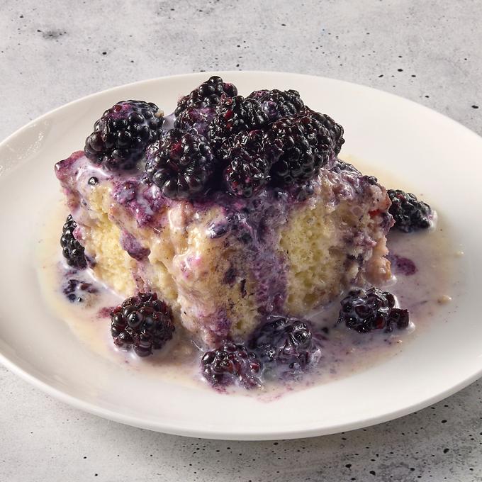 - Slowly and evenly pour milk mixture over cake to soak into all the holes. Let cake sit for 10 minutes then add crushed blackberries and all collected juices evenly on top.