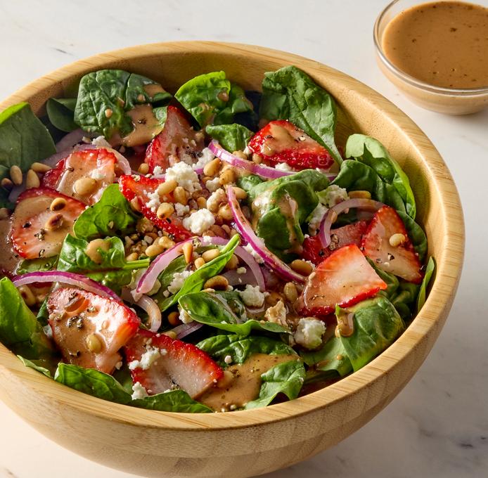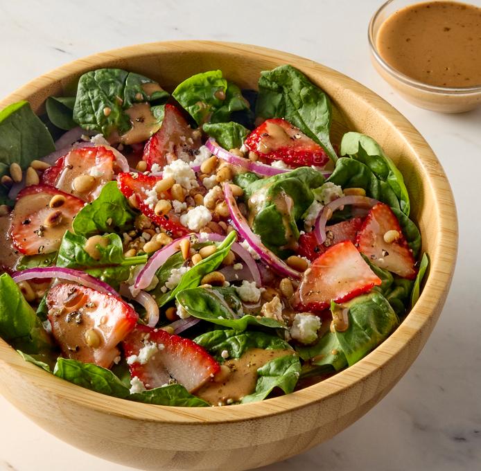 - Scatter strawberries, goat cheese and toasted pine nuts over dressed spinach. Top with freshly ground pepper if desired. Toss lightly and serve immediately.