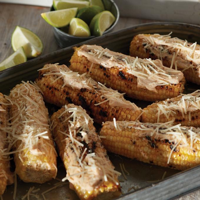 - Remove corn from grill and spread mayonnaise mixture on each piece to cover. Sprinkle with Parmesan cheese and serve.
