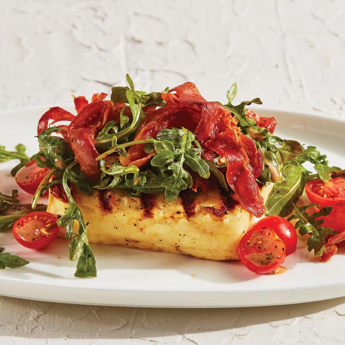 - Toss arugula and tomatoes with balsamic vinaigrette. Mound on top of seared cheese and top with prosciutto. Serve immediately.