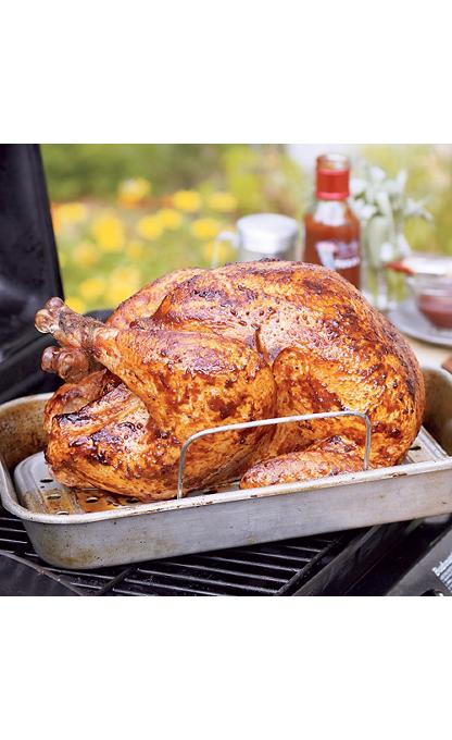 - Place turkey breast side up on a metal rack in a large roasting pan. Arrange pan on prepared grill. Grill 2-3 hours, about 11-13 minutes per pound, until turkey registers an internal temperature of 180°F in the thigh and 165°F in the breast. Remove from grill and let stand 15-30 minutes before carving.