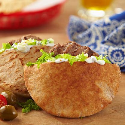 - Slice hamburgers in half and fill pocket with half a burger and top with lettuce mixture.