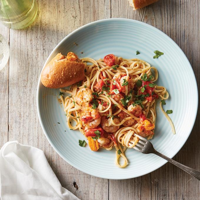- Turn heat down to medium and add sauce. Stir to coat shrimp. Bring to a simmer and add pasta to pan. Stir just to heat through, about 2 to 3 minutes.