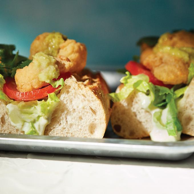 - Add shrimp and a drizzle of That Green Sauce. Garnish with fresh cilantro and add top halves of baguette. Enjoy.