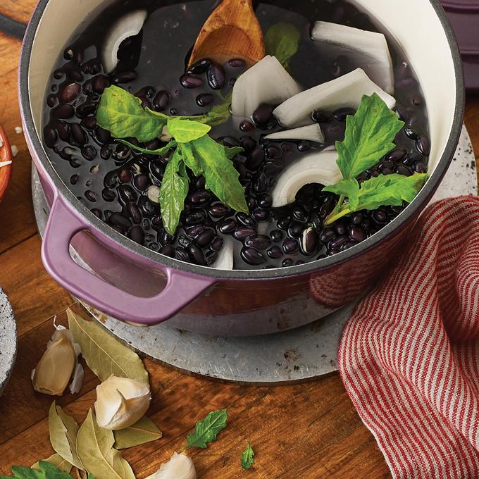 - Place black beans, onion quarters, bay leaves and epazote in a large pot. Fill with enough cold water to cover beans by at least 5 to 6 inches. Cover and leave on counter to soak overnight.