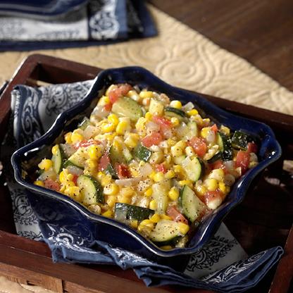 - Add zucchini, tomato and corn; stir to combine.