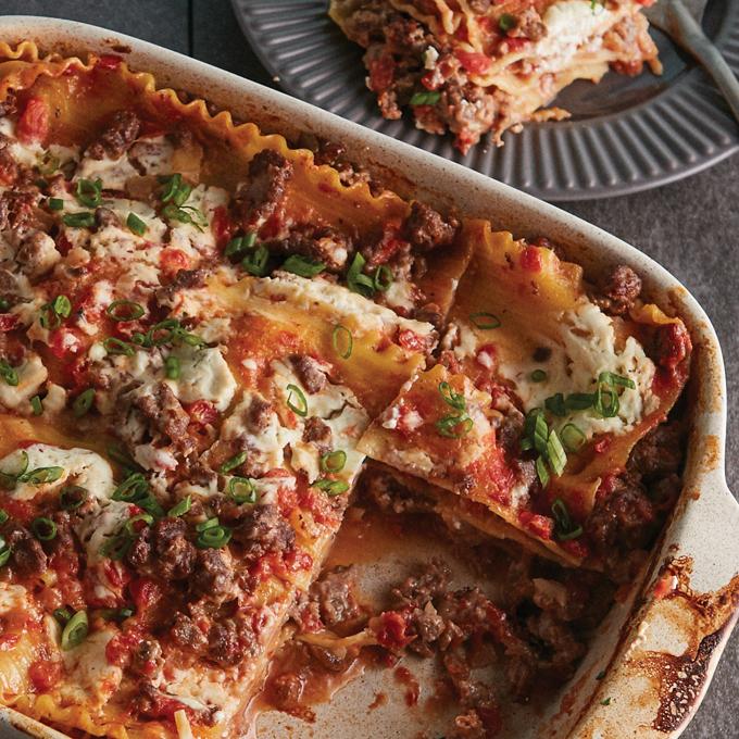 - To assemble the lasagna, spoon a small amount of meat sauce in the bottom of a 9 x 13-inch pan. Top with one layer of oven ready noodles, then follow with 1/4 of meat sauce and scatter a few dollops of sour cream. Repeat twice and top with remaining meat mixture and sour cream.