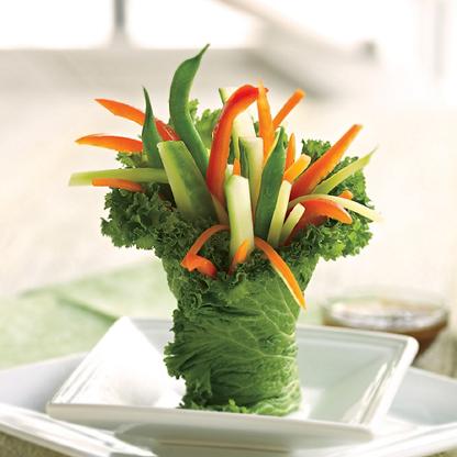 - Fill mustard green leaves with 3-4 slices of red pepper, 1-2 sticks cucumber, and green beans. Sprinkle with broccoli slaw mix.