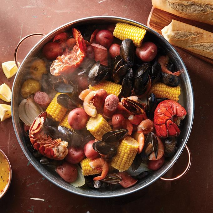 - Spoon seafood onto a large platter, discarding any unopened clams. Drizzle with steaming liquid, melted butter and lemon juice.