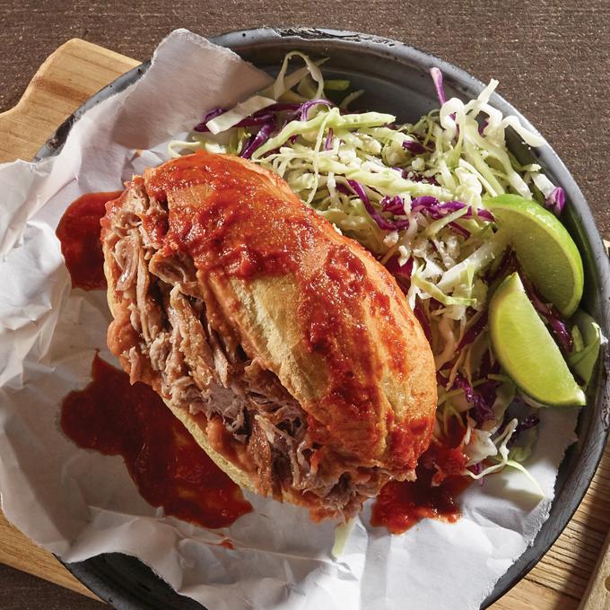 - Slice bolillos down the middle then spread cut sides with refried beans. Top with pork and place sandwiches on plates.