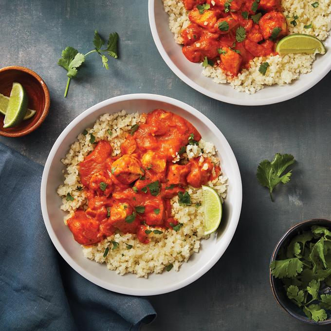 - Stir in cooking sauce and bring to a simmer for 5 minutes. Garnish with chopped cilantro and serve with cauliflower rice.